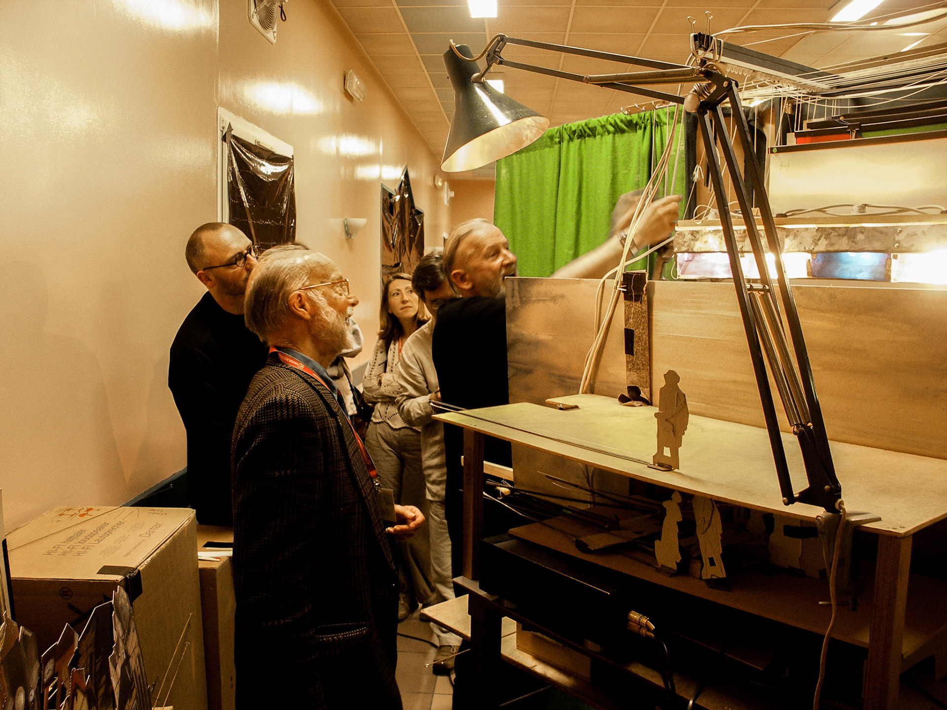 Salle Napoléon III > Laurence Webb (hinten rechts) eröffnet eine Webb-Papiertheater- Ausstellung mit dem Vortrag über die Geschichte seines Urgrossvaters William George Webb
